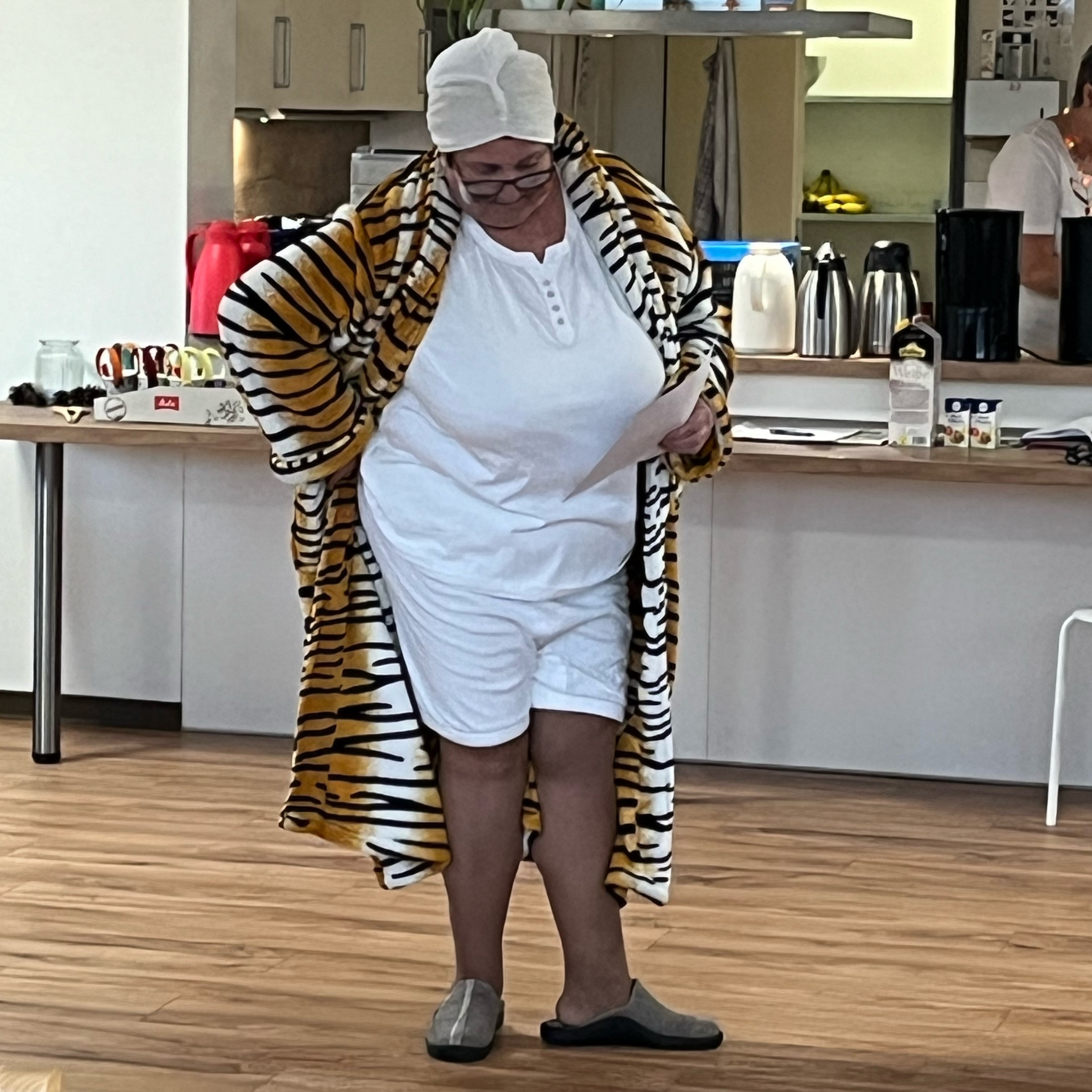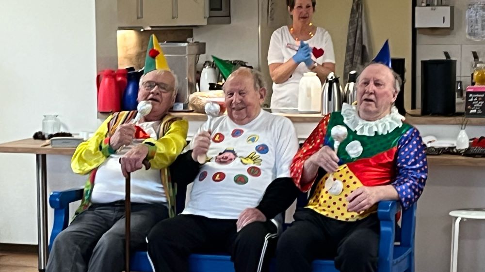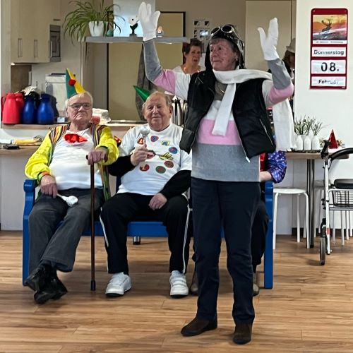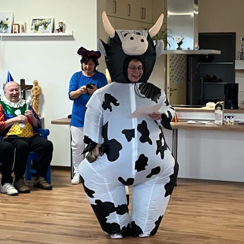 Es gab Kaffee und Kuchen und ein kurzweiliges Programm aus Schunkelrunden, Tänzen, Sketchen und Büttenreden, die durch die Mitarbeitenden und Tagesgäste einstudiert und aufgeführt wurden. Bernadette Langhorst erzählte zum Beispiel als Kuh verkleidet von ihrem Kuhleben und die frühere Kollegin Angelika Knöchelmann trat als „taffe Frau“ in die Bütt. Die Tagesgäste Josef Otto, August Jünemann und Reinhard Schwalk gaben als Mainzer Chorknaben ein Lied zum besten.