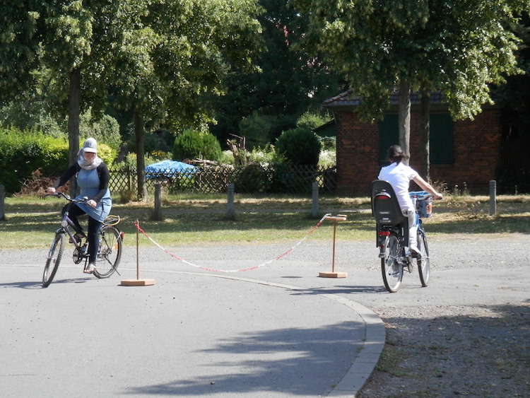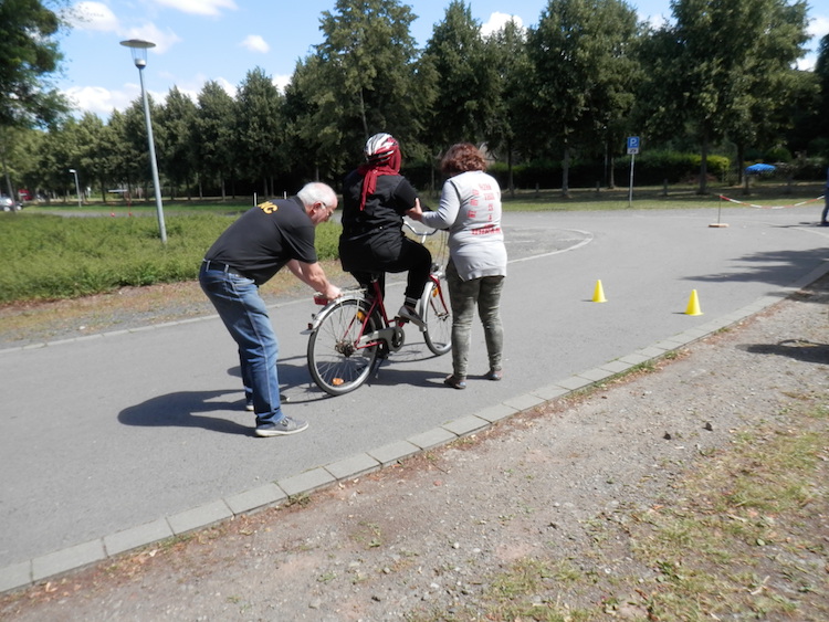 Alle Teilnehmerinnen waren sehr aufmerksam und haben durch viele Verständnisfragen den Theorieteil bereichert. Beim praktischen Training galt es, einen Parcours zu absolvieren, der selbst für manchen geübten Radfahrer eine Herausforderung darstellte. Beispielsweise wurde das Aufnehmen einer Kette während der Fahrt geübt. Nachdem mit der Kette in der Hand ein Kreis gefahren werden musste, sollte sie ohne anzuhalten wieder an den Ausgangspunkt gelegt werden. „Neben dem Lerneffekt kam der Spaß und die Freude am gemeinsamen Erleben nicht zu kurz“, versichert Diesmann.