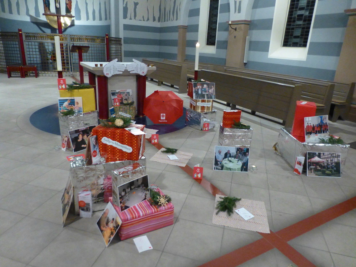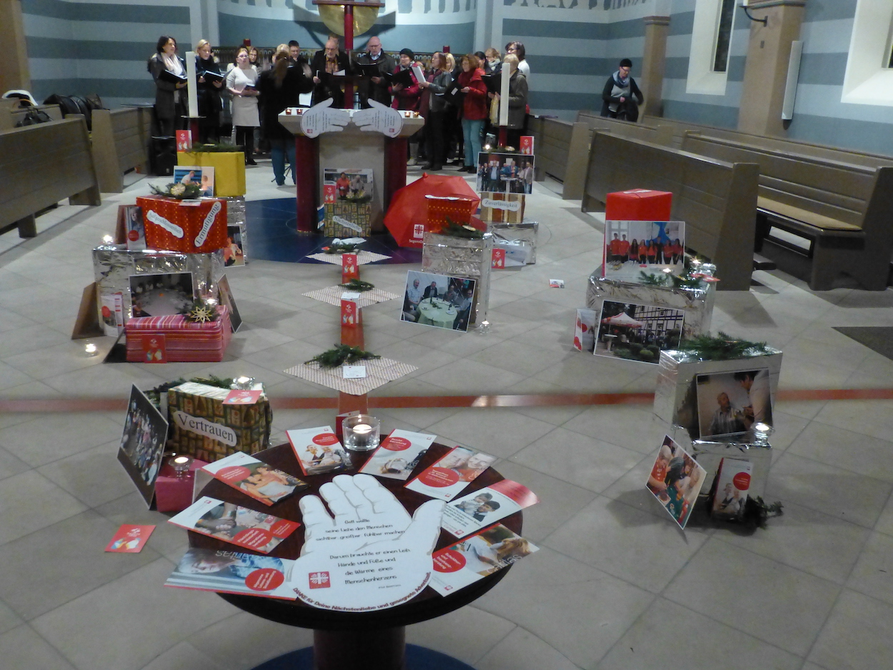 Lydia Ballhausen lud die Mitarbeiterinnen und Mitarbeiter ein, „auf Tuchfühlung“ zu gehen und hellhörig zu werden, den Blick zu schärfen sowie Gutes zu tun. Dazu waren „Überraschungspakete“ Mitmenschlichkeit als Mitte gestaltet mit Fotos von Alltagsszenen der Caritasarbeit.