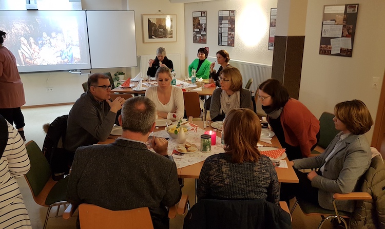 Anhand der Bildmeditation, aber auch durch die entsprechenden räumlich vorbereiteten Tische, wurde die Gesellschaft des Bildes reflektiert und überlegt: wie wäre es wenn ich mit Platz an dieser Tischgemeinschaft hätte. Führt das Arbeiten in der Caritas zur Einheit von Randexistenzen, Verstoßene und Armen, wie nehmen wir Anteil, zeigen wir Verständnis bei Kollegen und Klienten und Angehörigen? Abschließend erhielten die Mitarbeiter einen Stein als Anstoß zum Neuanfang und Umdenken in dieser Fastenzeit.