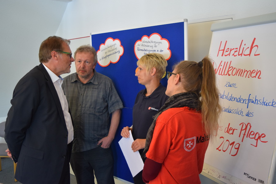 Er zeigte sich begeistert von den jungen Leuten, die er bei einem Frühstück zum Tag der Pflege traf. Der Sinn des Lebens sei zu wissen, „dass man eine gute, sinnvolle Tätigkeit ausübt“, was den Caritas-Azubis gelinge, meinte Reuter.