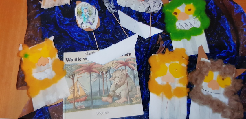 So starten wir mit unseren 8 Kindern der Sprachheilgruppe das Theaterprojekt und schauen zunächst das Bilderbuch „Wo die wilden Kerle wohnen“ von Maurice Sendak an. Es ist eine fantastische Geschichte aus 333 Wörtern über das Quatschmachen, über laut  sein, stark sein, aber auch über den Wunsch nach Liebe, Ruhe und Geborgenheit.