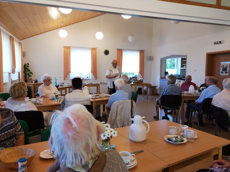 Ab 8 Uhr waren die 5 „Kutscher“ unterwegs um jeden Urlaubsgast persönlich an der Haustüre abzuholen- natürlich ohne Koffer denn am Abend geht’s zurück ins gewohnte Bett. Der Breitenberg hatte sich vorbereitet und es blinkte und glänzte rundum das Pfarrzentrum, sogar ein „Herzlich Willkommen“ Schild war angebracht. Gleich nach der Begrüßungs- und Vorstellungsrunde wurde das durch zahlreiche ehrenamtliche Helfer farbenfrohe Frühstücksbüffet eröffnet. Ein Reisepass und Namensschilder steigerte die Vorfreude und schnell war das fremdeln verflogen und aufregende Tischgespräche kamen zustande. Als einen festen Bestandteil hat sich auch beim 4. Mal der Reisesegen durch Propst a D Wolfgang Damm etabliert. Er spannte an diesem Morgen den Bogen zur großen Wallfahrt in Germershausen und erinnerte an den Festtag Mariä Heimsuchung. Nach Fürbitten und dem gemeinsamen Vaterunser wurde ein erstes Reiselied angestimmt.