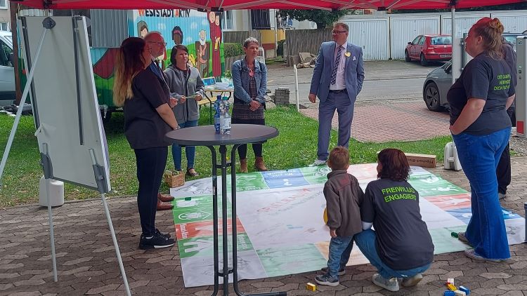 Schon zur Einweihung des Inklusiven Campus Duderstadt konnten wir den Bauwagen wieder an Ort und Stelle präsentieren. Interessiert zeigten sich Vertreter:innen aus Gesellschaft und Politik. Wir nutzten die Gelegenheit des Besuches und spielten gemeinsam das Großbrettspiel „Spielraum für gute Nachbarschaft“, welches von der LAG Soziale Stadtentwicklung in einer Kooperation mit der Landeszentrale für politische Bildung (LpB) und dem „Spielfeld Gesellschaft“ entwickelt wurde. Hierbei gab es einen tollen Austausch und Gespräche und es entstanden gemeinsam neue Ideen für das Zusammenleben in und rund um die Kolpingstraße.