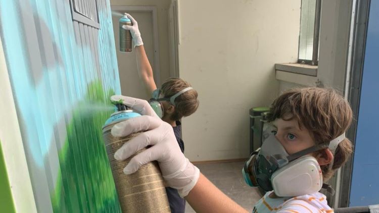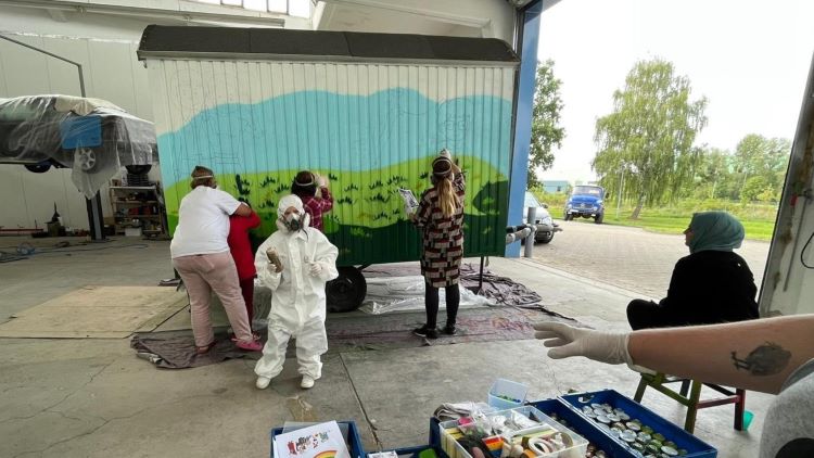 Dann kam die Grundierung, welche die Bewohnenden nach Feierabend gemeinsam auftrugen. Unter all den vorab eingesandten Gestaltungsideen entwarf Suse Bednorz dann ein tolles Design. Dies wurde gemeinschaftlich mit ihr von Groß und Klein gesprayt. Alle gaben sich große Mühe, damit der Bauwagen auch von außen eine schöne Sache wird. Anschließend wurde zusammen gegessen und die Freude war bei allen groß über das fertige Resultat. Wir finden auch, der Bauwagen sich so sehen lassen kann. Er ist nun noch mehr Ausdruck der Vielfalt der Menschen, die im Projekt Gemeinsam.Weststadt.Aktiv. zusammenkommen, sich engagieren, etwas bewegen und damit etwas verändern können.