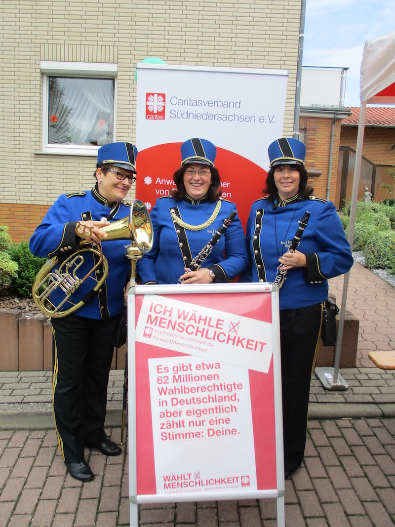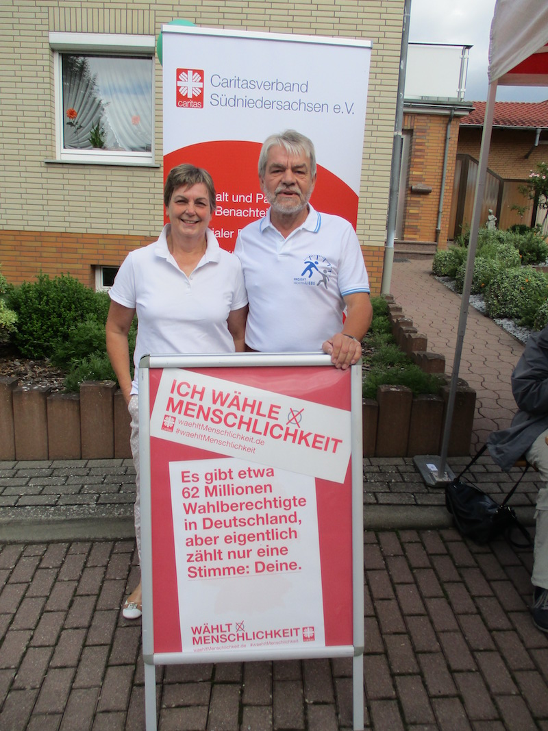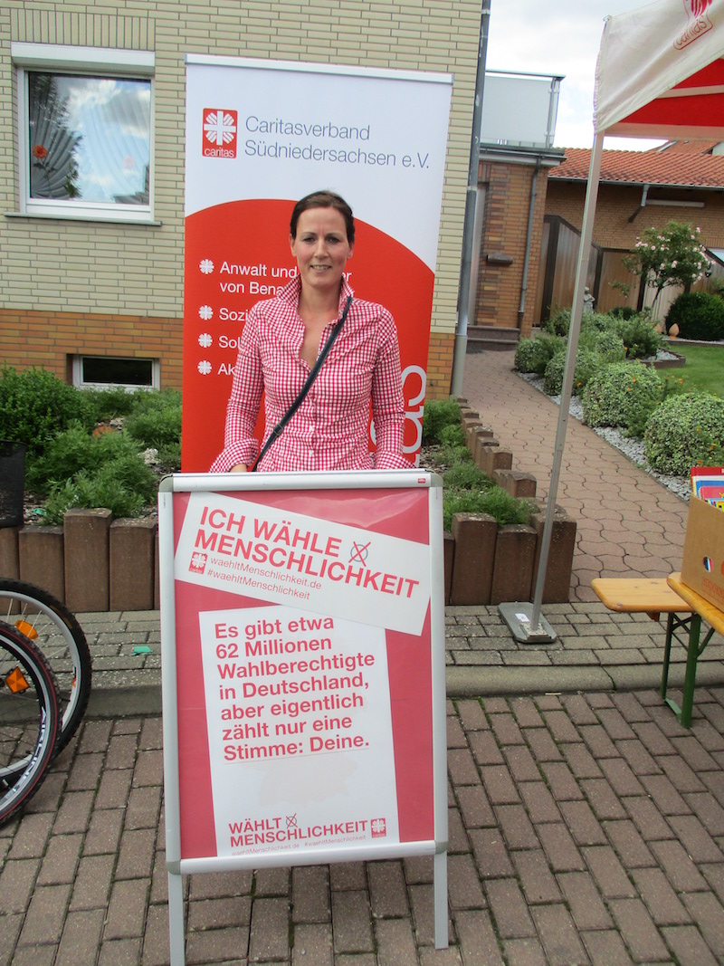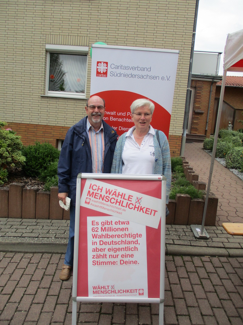 Den Anfang machte der Göttinger Dechant Wigbert Schwarze. Er stellt sich lächelnd hinter den Plakataufsteller und hebt den Daumen. „Ob Propst Galluschke, Dechant Schwarze oder Caritas-Vorstand Ralf Regenhardt – alle haben mitgemacht", berichtet Lioba Stadermann vom Caritasverband Südniedersachsen. „Bei der Aktion wollten wir ganz normale Menschen zeigen. Das ging leicht im Rahmen des Pfarrfestes von St. Cyriakus, auch viele Gemeindemitglieder und Gäste haben mitgemacht." Die entstandenen Fotos lassen mit ihrer Ausstrahlung viele bunt-glatte Wahlplakate verblassen.